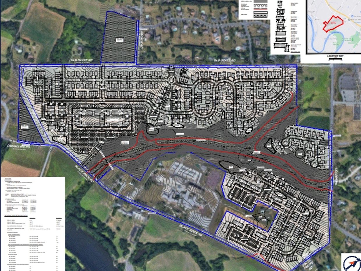 The plan called for 500-700 apartments and an unspecified number of townhouse and single family houses along with office and commercial uses. Due to the community's overwhelming objection to this plan, which does not conform to the Township's zoning, the plan was never officially submitted .