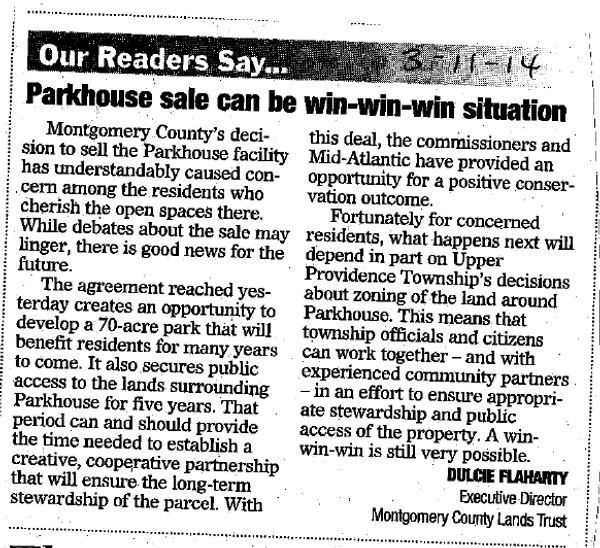 The Township is partnering with the Natural Lands Trust (formerly Montgomery County Lands Trust) in this endeavor. This does not necessarily provide comfort, given their response to the sale of Parkhouse. The Letter to the Editor, right, was published in several local newspapers on March 11, 2014, immediately following the County's sale of the land. Natural Lands played politics with Parkhouse 11 years ago. There is no reason to trust that they will not do it again.