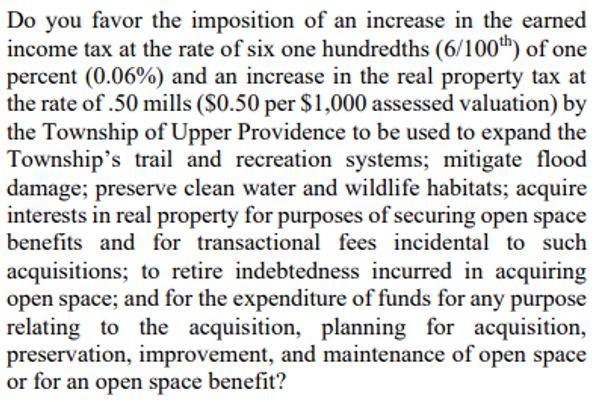 This ballot measure seems less about realistically acquiring open space and more about providing cover to a Board of Supervisors who ultimately betrayed the residents of Upper Providence on Parkhouse, the largest parcel of remaining open space in the Township. By caving in to developer demands and not fighting for the existing zoning, this Board failed its residents, and the imminent development, which you can be sure will not break ground during a municipal election year, will forever alter the character of this Township.