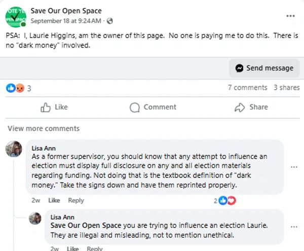 Who will be on this Board? Former Supervisor Laurie Higgins had been anonymously (and therefore illegally) championing this cause with yard signs and a Facebook page until she was called out. It just so happens that there are a few parcels designated as “Open Space Priorities” right up in her neighborhood. Which properties on this map do you think the “Open Space Review Board” will choose to focus on first?