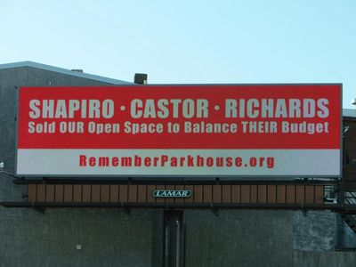 The Remember Parkhouse group raises enough money to buy billboards at Markley and Main Street in Norristown, and in Pottstown on Route 422, reminding the public that Shapiro, Richards and Castor sold our open space. The billboards run for one month.